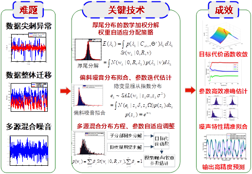教师团队针对厚尾异常值、非对称偏斜噪声、混合噪音等复杂干扰对建模影响开展系统性的研究,创新性地提出了一系列面向复杂低质数据条件下的工业过程鲁棒高效建模算法,以中国矿业大学为第一单位,刘鑫副教授为第一作者,代伟教授为通讯作者,在Automatica、IEEE Transactions on Automation Science and Engineering、IEEE Transactions on Instrumentation and Measurement、自动化学报等中英文Top期刊上连续发表多篇高质量论文,主要创新贡献如下: