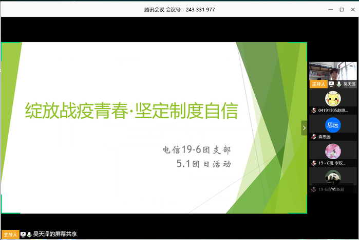为了激励和引领同学们进一步坚定制度自信,贯彻落实习近平总书记关于疫情防控工作的系列讲话精神,澳门6合彩开奖 电子信息类19-6班团支部于51日开展绽放战疫青春·坚定制度自信线上主题团日活动。会议由团支书吴天泽同学主持,班级全体同学参加了会议。