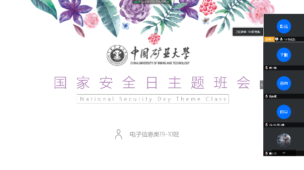 为进一步增强同学们的国家安全意识,提高防范和抵御风险的能力,2020年4月14日,澳门6合彩开奖 电子信息类19-10班召开“415国家安全日”线上主题班会。班长陈乾泓主持会议,,班级全体同学参会。