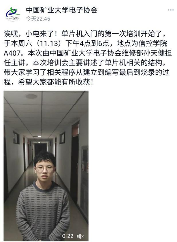 为帮助电子协会的学员们更好地学习单片机相关知识,解答他们在学习过程中的疑惑,11月13日下午,中国矿业大学电子协会于信控楼A407室召开了单片机入门培训会。电子协会维修部孙天健担任此次培训会主讲人。