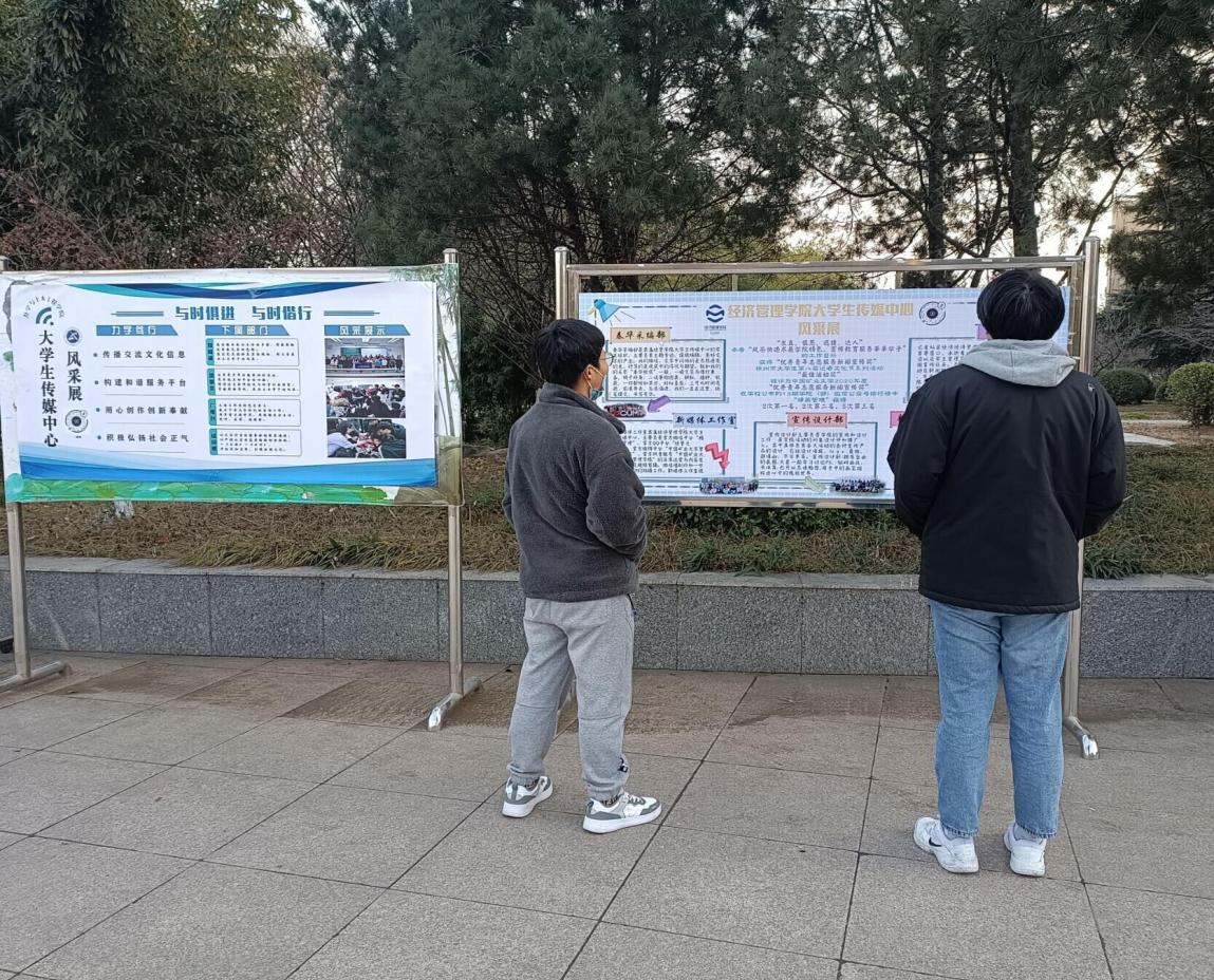 大学生传媒中心通过QQ公众号、微信公众号等平台进行了活动宣传。活动中,各学院以精心设计的展板向同学们展示各自风采,各具特色的展板吸引了同学们纷纷驻足观看。其中,公管学院以图文结合的形式,向同学们展示了新闻部、新媒体等四个部门的具体工作流程,介绍了公管学院“求真高效,务实创新”的新闻理念。活动最后,工作人员将各个学院的展板图片上传至微信平台,并通过微信投票的方式评选出优秀展板。