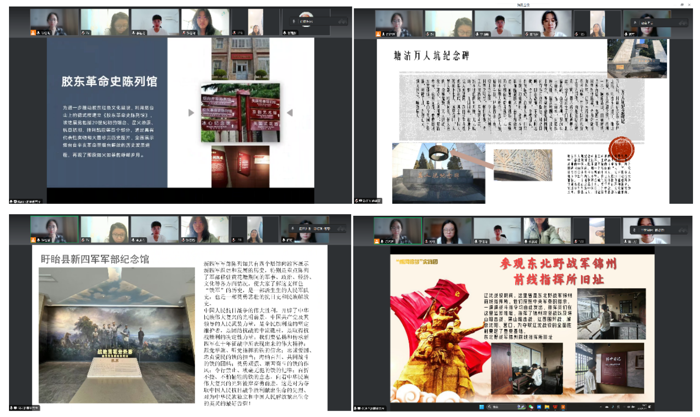 8月7日,团队成员在线上分享家乡的红色事迹,在交流中,每个人的心中感慨万千。在成员对东北野战军的讲解中,团队其他成员感受到了战争的残酷与艰辛,深知幸福生活的来之不易;在对新四军的讲解中,亦深刻体会到“没有共产党就没有新中国”,团队成员坚定了始终跟党走的决心;在跟着团队成员参观胶东革命史陈列馆的过程中,胶东革命精神牢牢地扎根在成员心中;在万人坑纪念碑的参观中,团队成员更深刻体会到和平的重要。