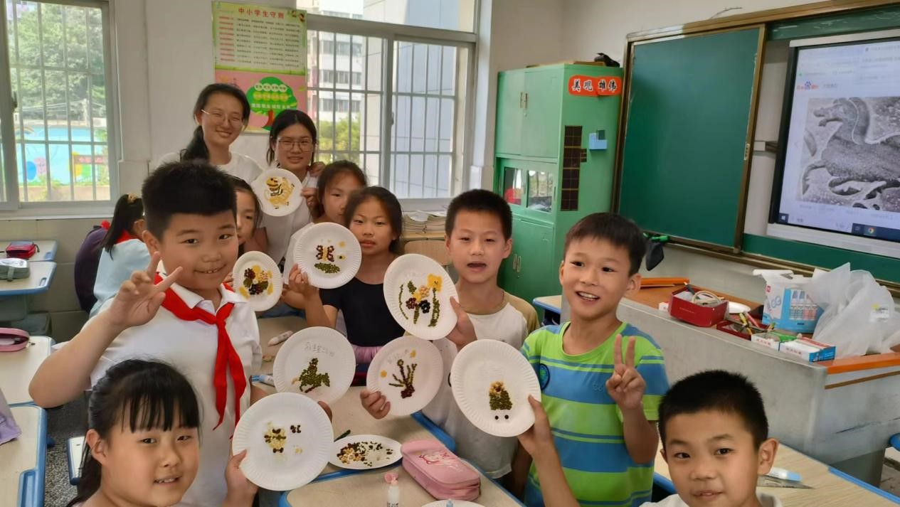 7月23日,团队来到和平桥小学。成员们首先向孩子们介绍了徐州汉画像石的历史及文化价值,借生动的故事和丰富的图片,激发他们对这一传统艺术形式的浓厚兴趣。随后,团队成员引导孩子们动手制作粮食画。孩子们聚精会神,以五谷杂粮为笔,创作出一幅幅充满汉文化韵味的精美作品。