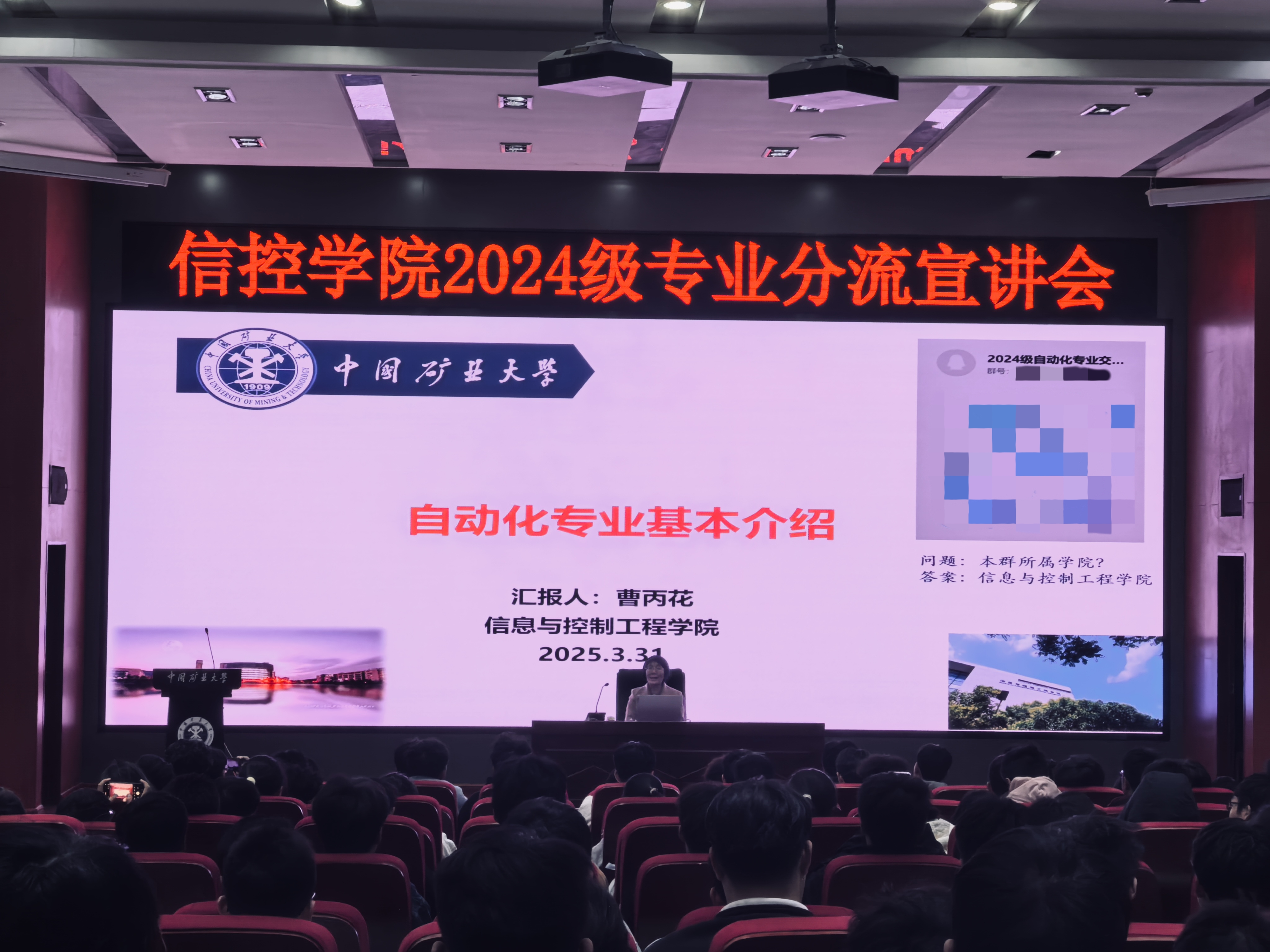 在学院楼A101报告厅召开电子信息类专业分流宣讲会。学院副院长刘海、电子信息系主任徐永刚、自动化系主任曹丙花及2024级电子信息类学生参会。
