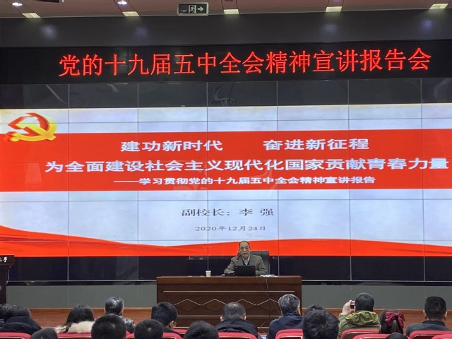 在A101报告厅举行学习贯彻党的十九届五中全会精神宣讲报告会,中国矿业大学副校长李强为学院党政领导、学院系部主任、教职工党支部书记、支部委员、学生党支部书记、党员代表以及学生骨干代表做宣讲报告。