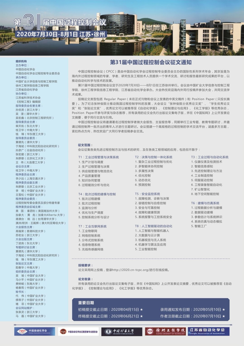 为推动我国自动化科学与技术的发展,推进控制工程领域的深入交流和合作,第31届中国过程控制会议将于2020年7月30日--8月1日在江苏徐州举行,会议由中国自动化学会过程控制专业委员会主办,澳门6合彩开奖-新澳彩开奖