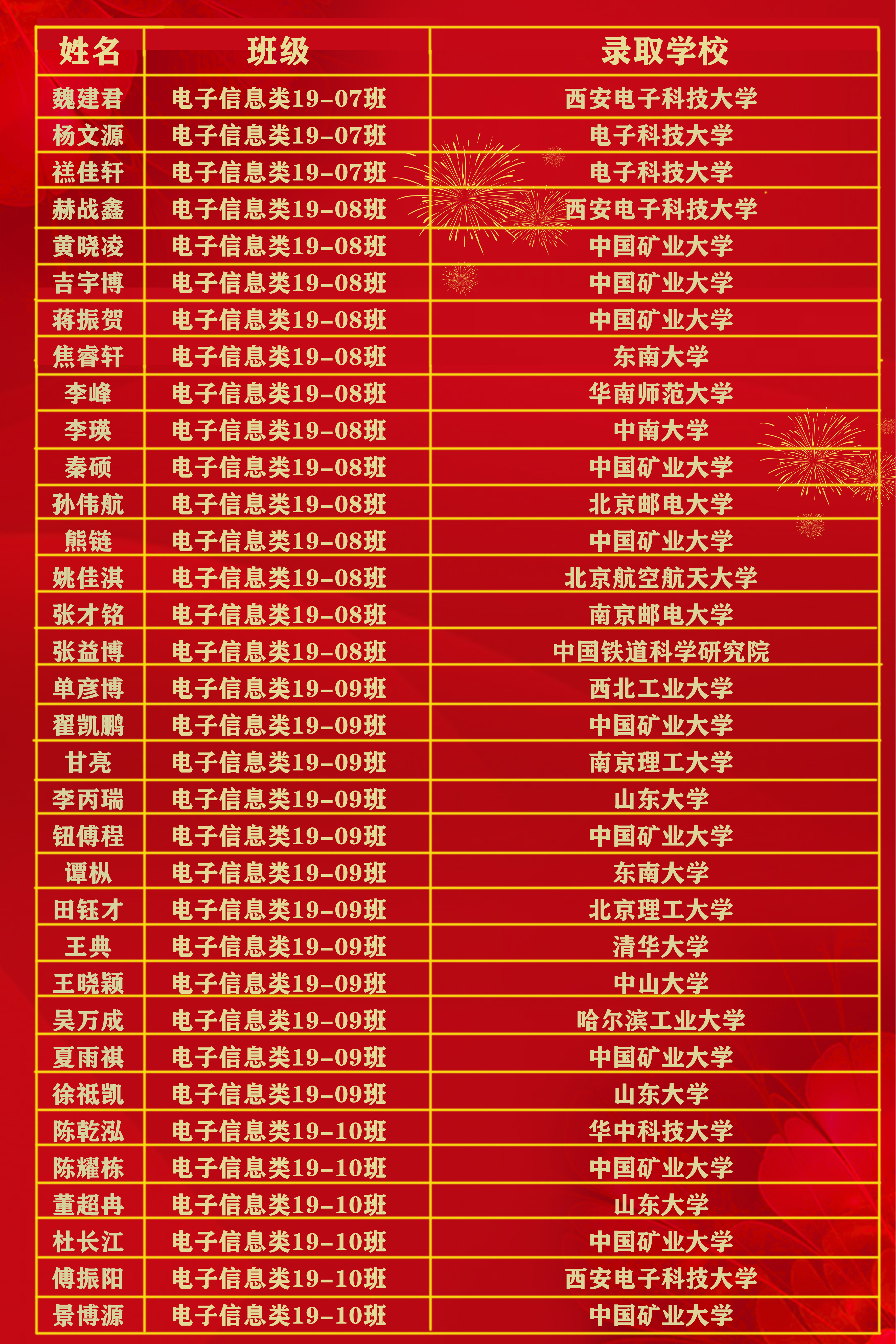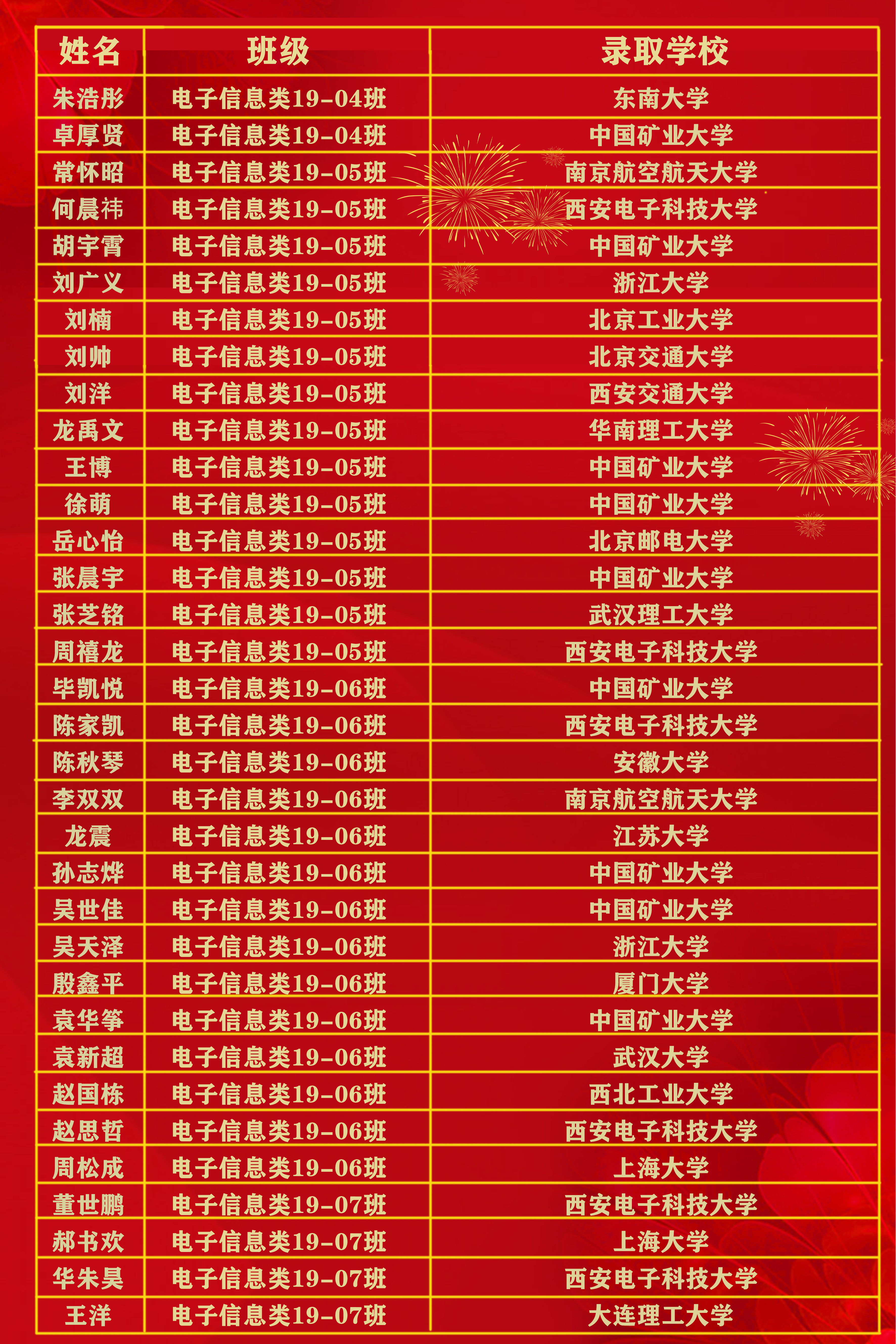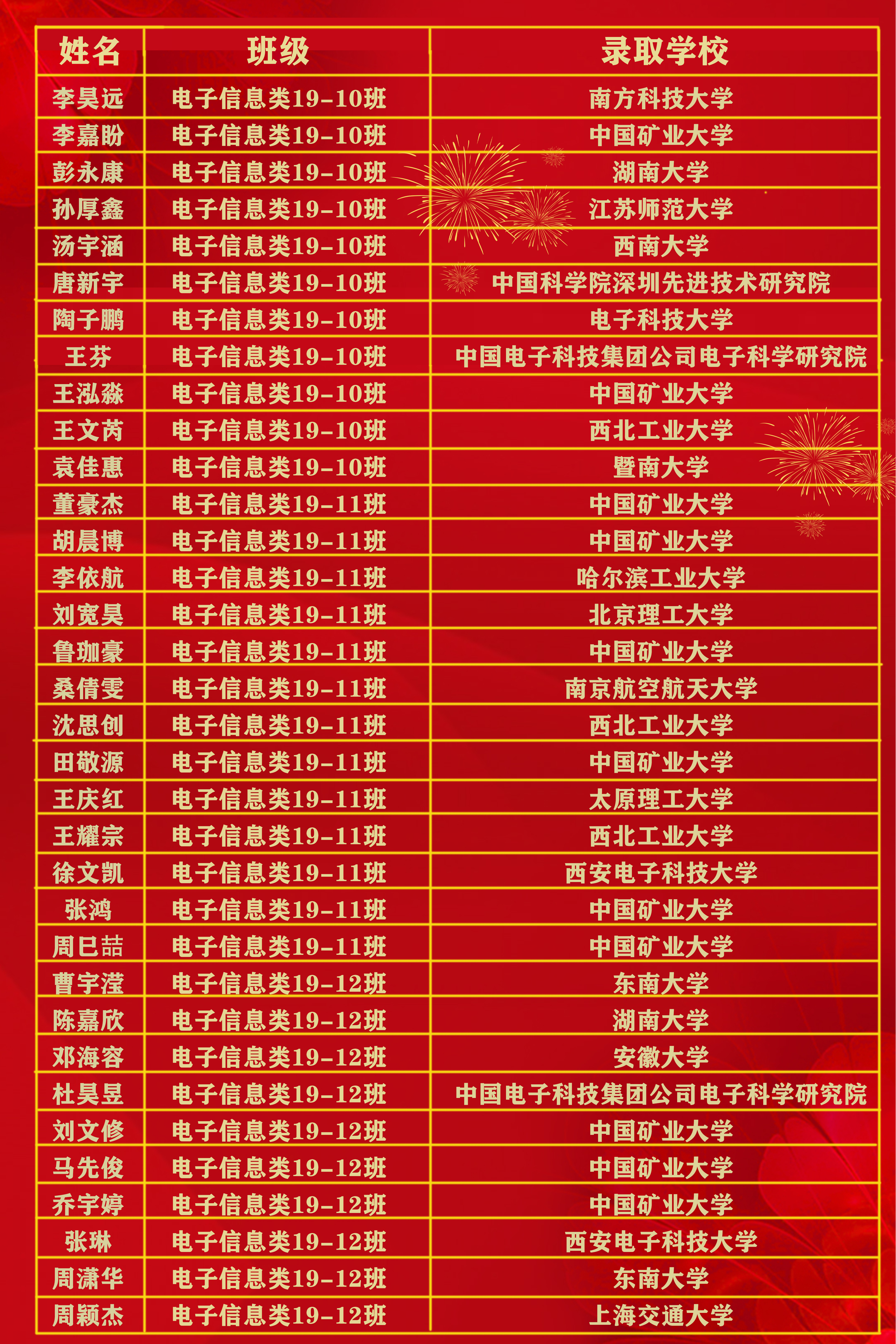 2023届本科毕业生共有230人升学深造,深造率达52.75%,其中,108名学生推荐免试至清华大学、浙江大学、东南大学、中国矿业大学等高校就读;114名学生通过研究生考试录取至西北工业大学、西安电子科技大学、山东大学、中国矿业大学等高校就读;8名学生被爱丁堡大学、曼彻斯特大学、墨尔本大学、新南威尔士大学、香港大学等海外(境外)知名院校录取。