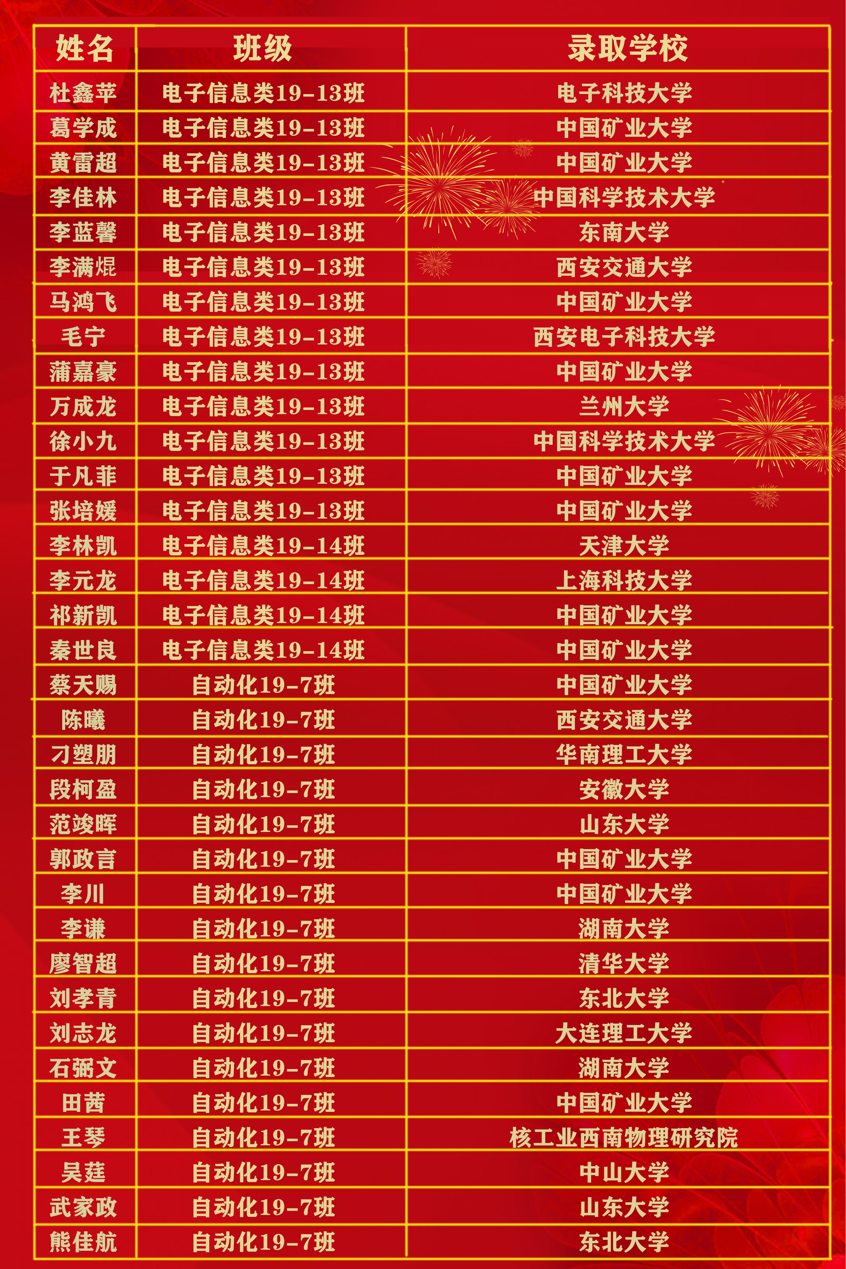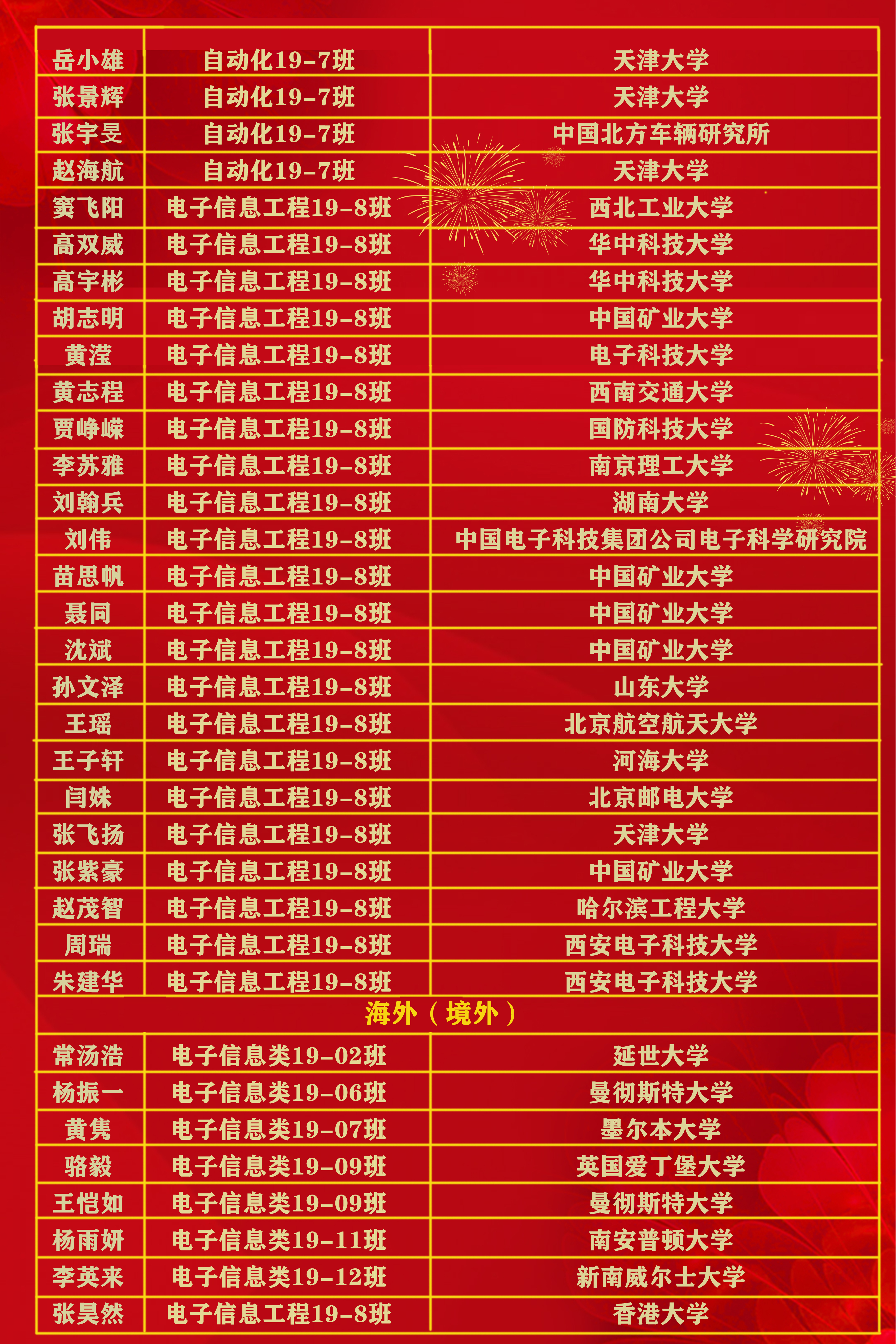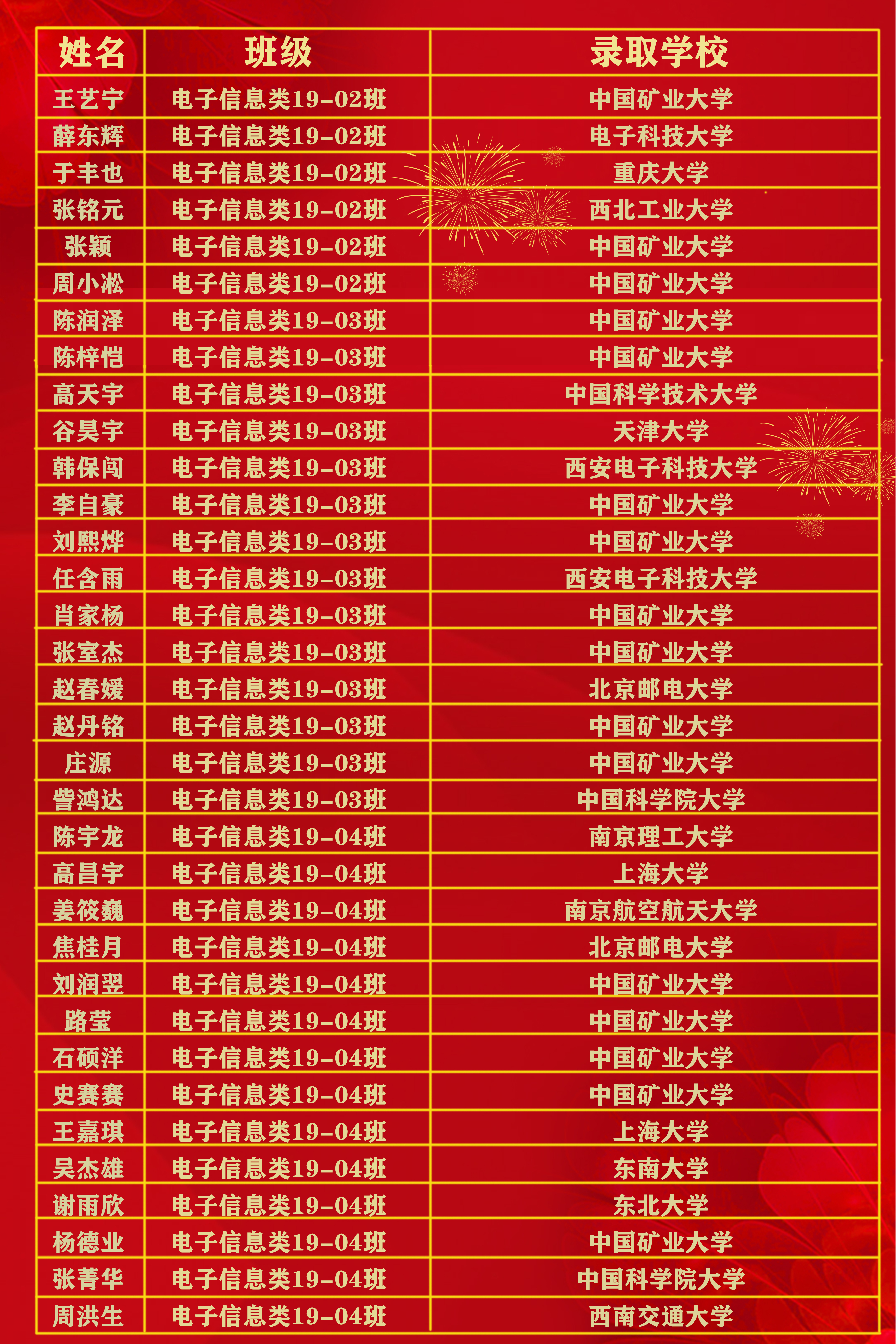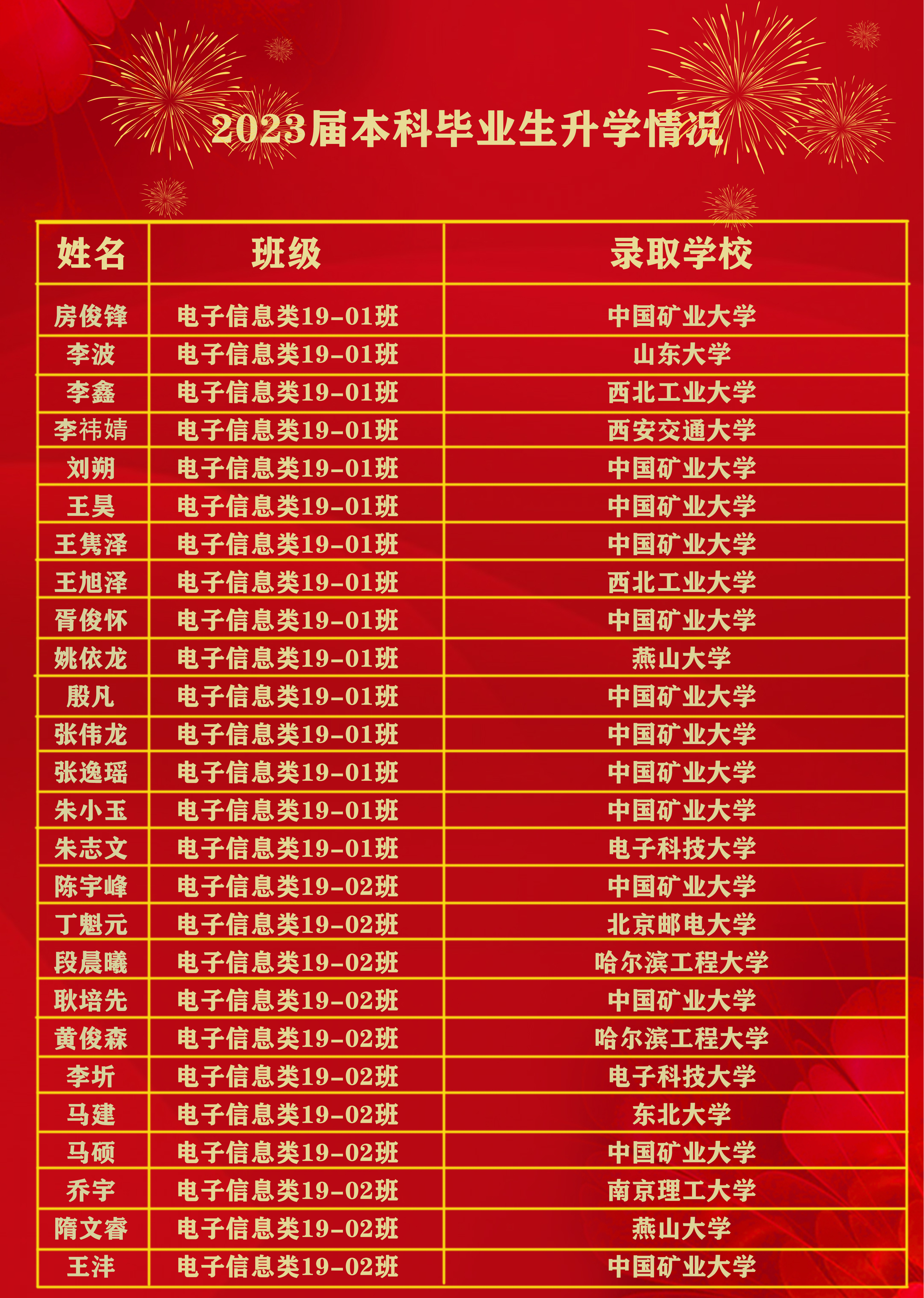 2023届本科毕业生共有230人升学深造,深造率达52.75%,其中,108名学生推荐免试至清华大学、浙江大学、东南大学、中国矿业大学等高校就读;114名学生通过研究生考试录取至西北工业大学、西安电子科技大学、山东大学、中国矿业大学等高校就读;8名学生被爱丁堡大学、曼彻斯特大学、墨尔本大学、新南威尔士大学、香港大学等海外(境外)知名院校录取。