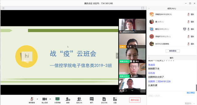 电子信息类19-3班通过腾讯会议在线平台开展了战“疫”云班会。本次班会由班长朱景豪主持,班主任管钰、辅导员李鸣轩出席了本次班会,3班全体同学参加。