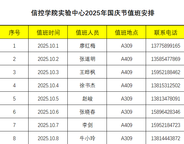 澳门6合彩开奖 实验中心2025年国庆节值班安排